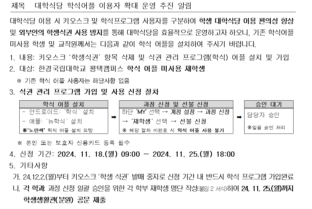 2024학년도 2학기 대학식당 학식어플 이용자 확대 운영 추진 알림