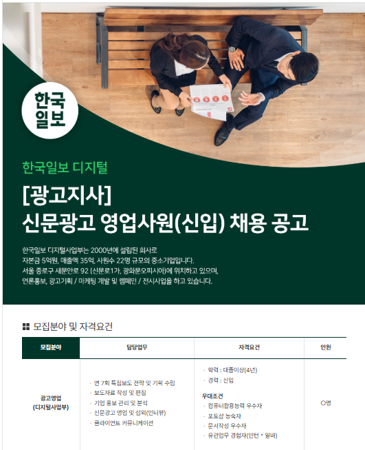 - 담당업무: 연 7회 특집보도 전략 및 기획 수립/보도자료 작성 및 편집/기업 홍보 관리 및 분석/신문광고 영업 및 섭외(인터뷰)/클라이언트 커뮤니케이션 등