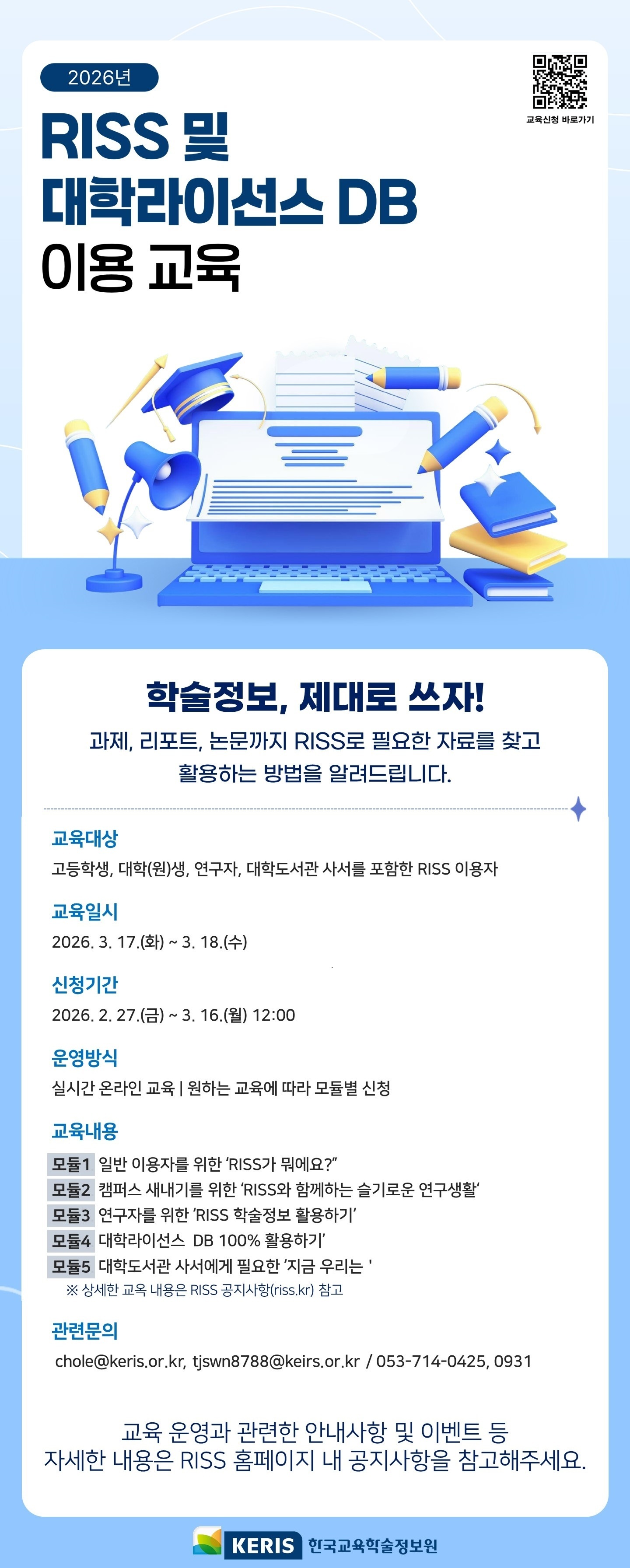 다. 내 용: 이용자를 위한 RISS 이용 방법, AI시대 학술정보 활용, 국내외 학술정보 활용 전략, 디지털 리터러시 교육 등 12개 교육