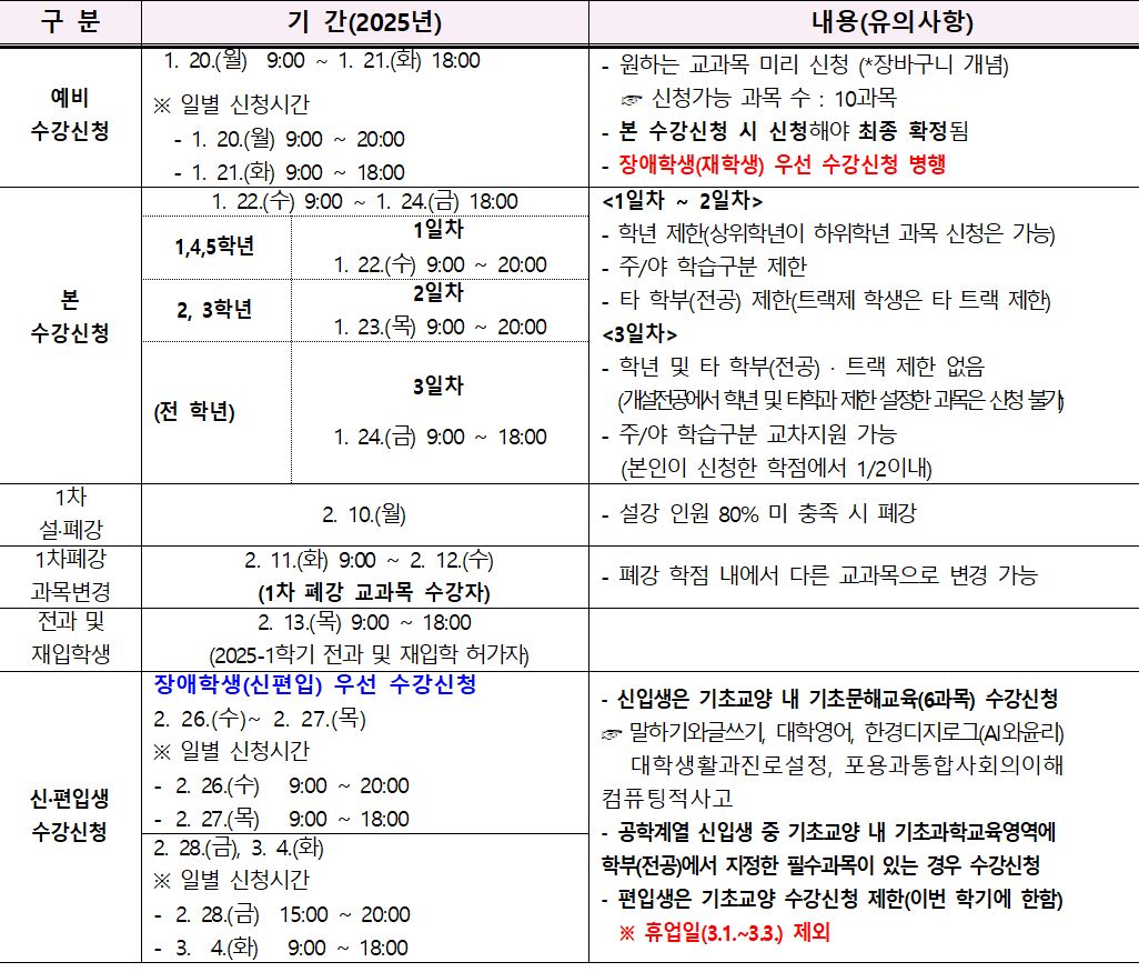 본 수강신청 1. 22.(수) 9:00 ∼ 1. 24.(금) 18:00
