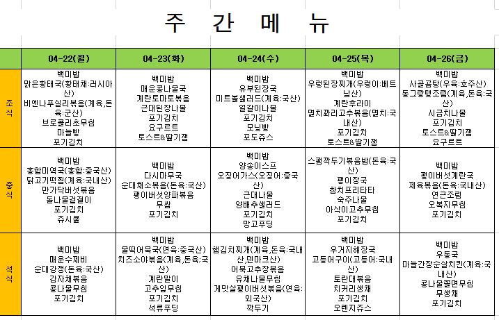 2024. 4. 15. ~ 2024. 4. 19. 주간식단표