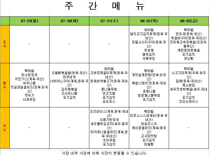 2024. 7. 22. ~ 2024. 7. 26. 주간식단표