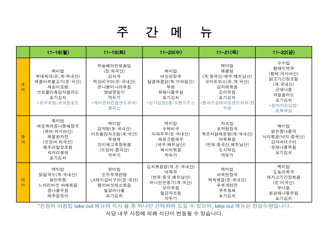 2025. 11. 17. ~ 2025. 11. 21. 주간식단표