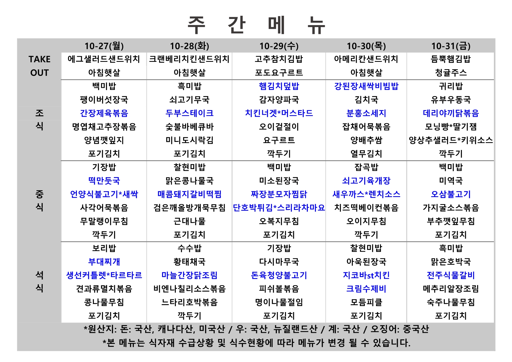 2025. 10. 27. ~ 2025. 10. 31. 주간식단표