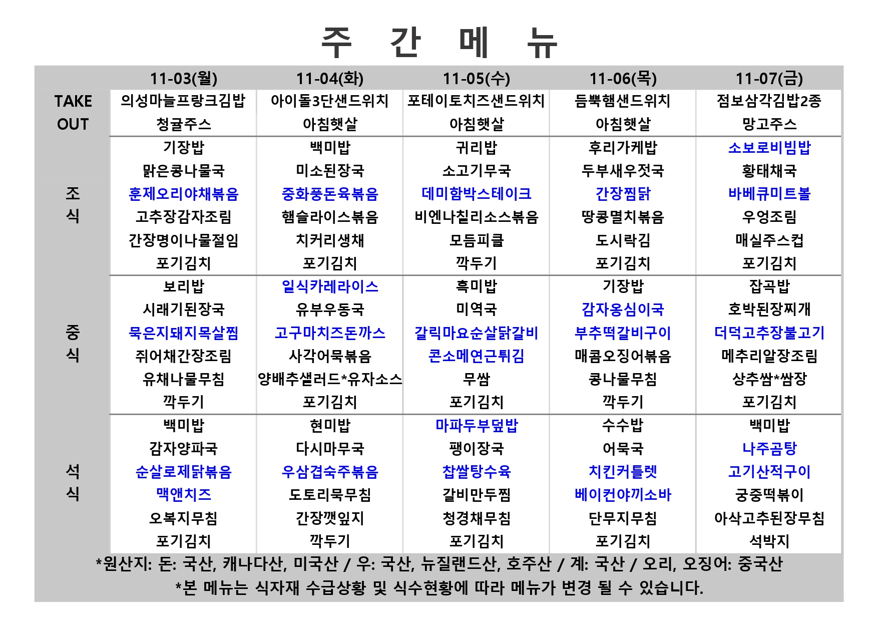 2025. 11. 03. ~ 2025. 11. 07. 주간식단표