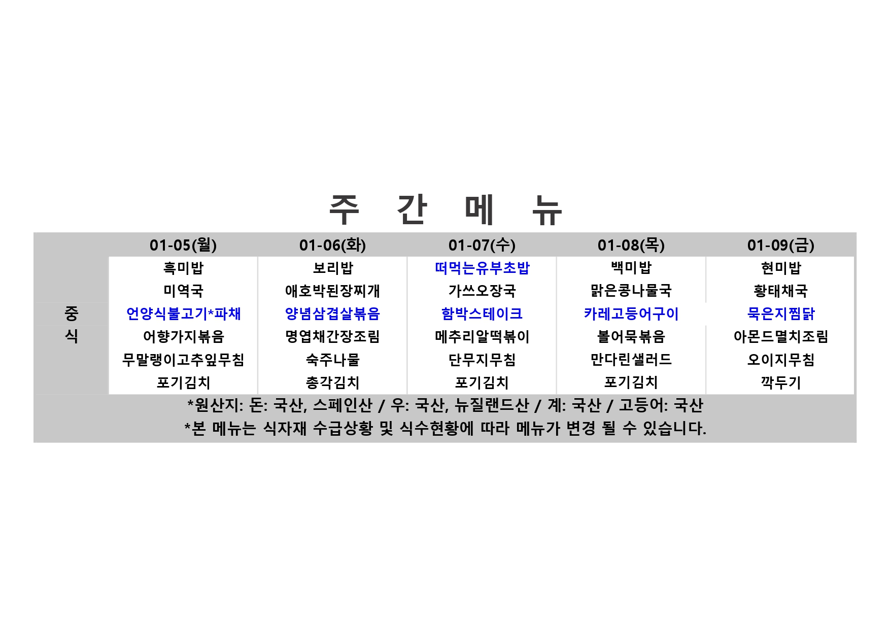 2026. 1. 5. ~ 2026. 1. 9. 주간식단표