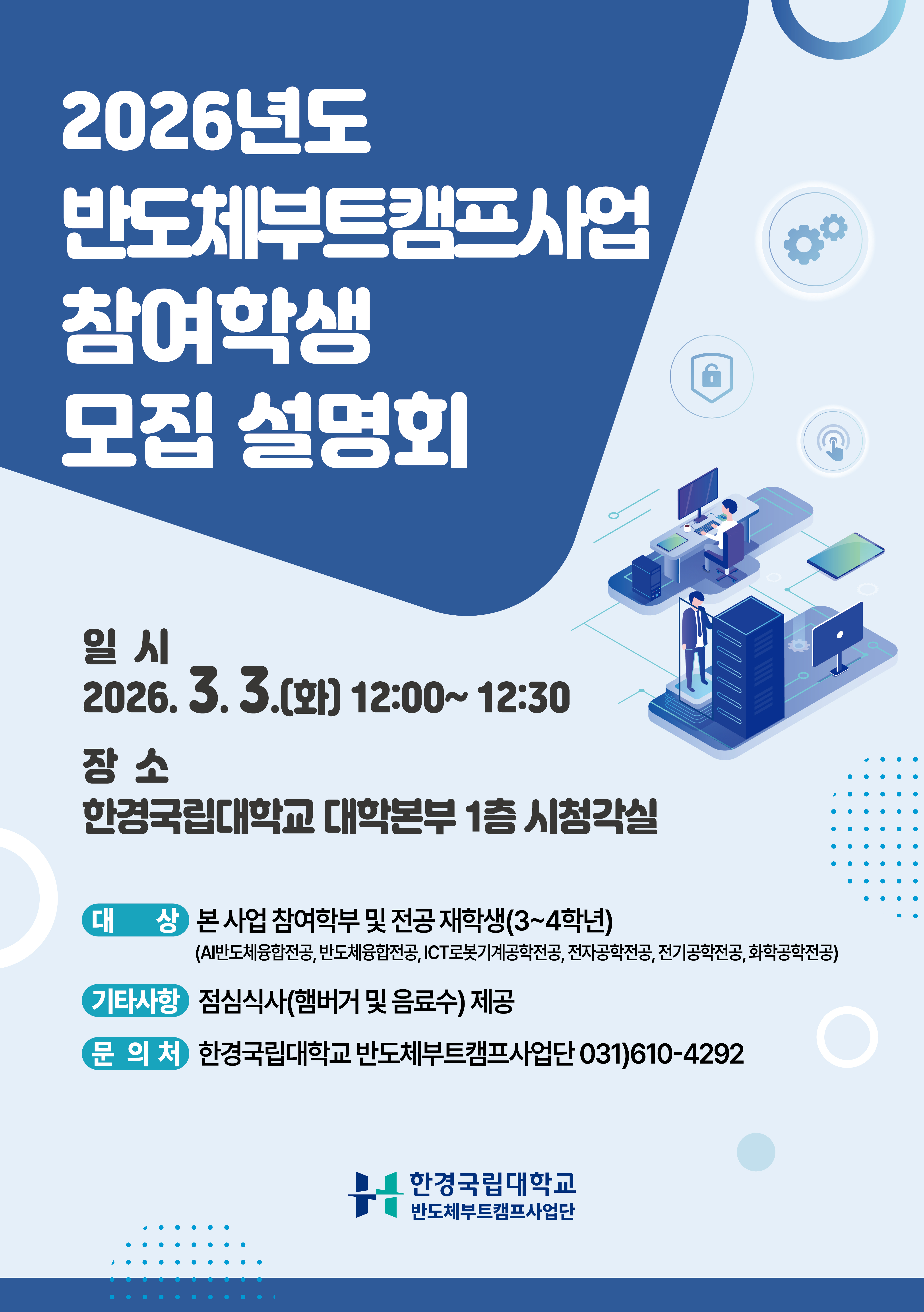 fnctId=bbs,fnctNo=721 단축 url 글번호 93145 2026년도 반도체 부트캠프사업 참여학생 모집 설명회 작성일 2026.02.25 수정일 2026.02.25 작성자 산학협력단 조회수 553 첨부파일 첨부파일이(가) 없습니다.