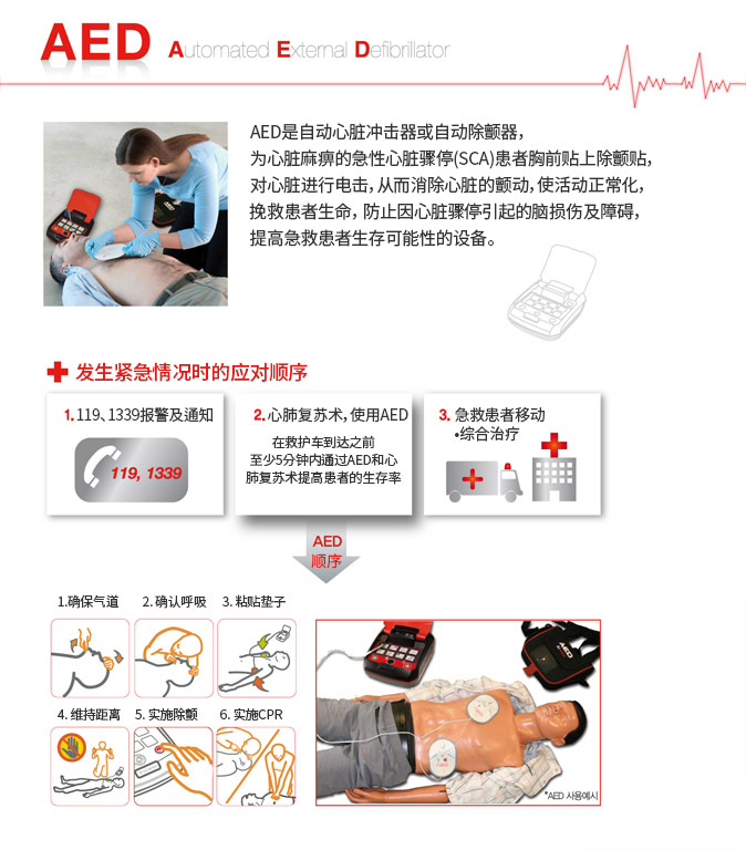 AED是自动心脏冲击器或自动除颤器,为心脏麻痹的急性心脏骤停(SCA)患者胸前贴上除颤贴,对心脏进行电击,从而消除心脏的颤动,使活动正常化,挽救患者生命,防止因心脏骤停引起的脑损伤及障碍,提高急救患者生存可能性的设备。