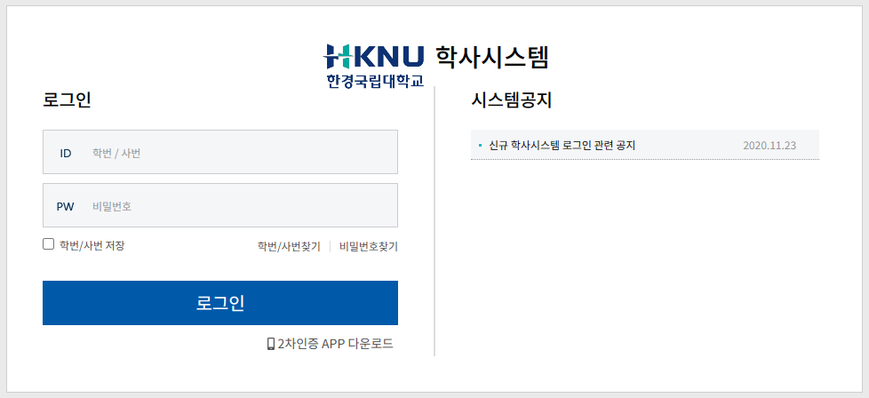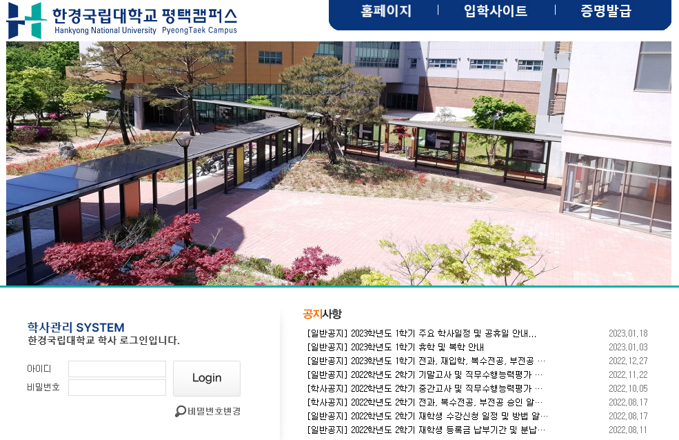 학사시스템(2023학년도 신입생 및 대학통합 전 한경대 재학생용)